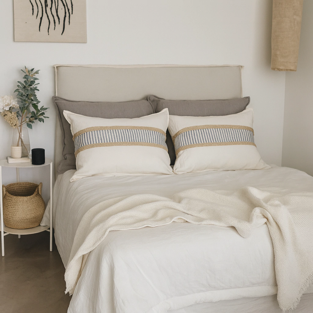 Funda de almohadón realizada en tusor liviano de algodón solapada en la parte de atrás. El relleno es de vellón siliconado hipoalergénico.