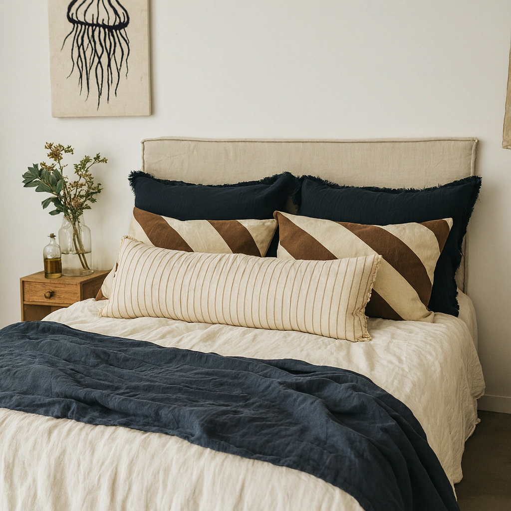 Funda de almohadón realizada en tusor liviano de algodón solapada en la parte de atrás. El relleno es de vellón siliconado hipoalergénico.